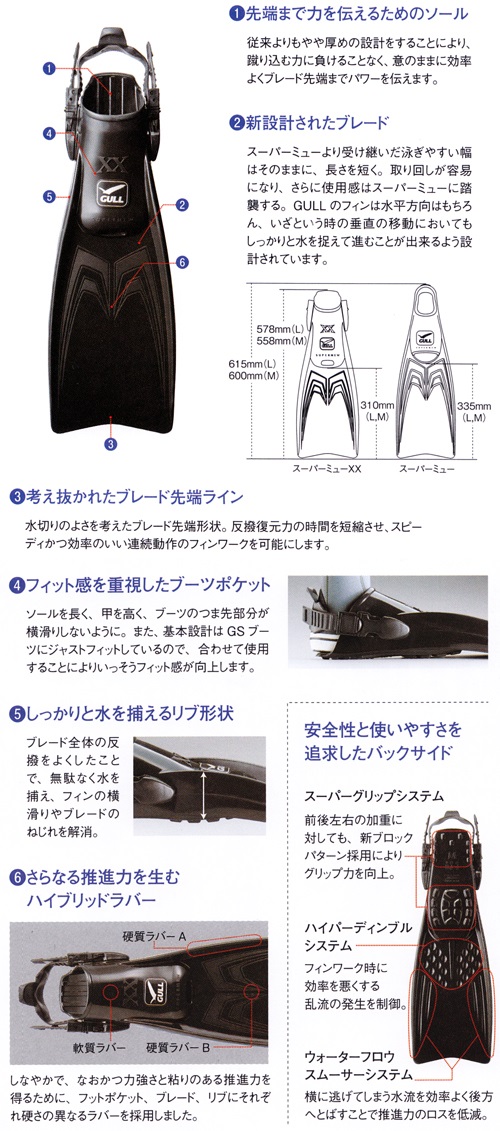 - 定評のあるSUPER MEWをストラップタイプにし、さらに運動性能もグレードアップ。あらゆるダイバーが快適に使用できるようにあえて全長・ブレード長を短く設計することで、取り回しが容易になりながらも、スーパーミュー同様、抜群の推進力を発揮します。